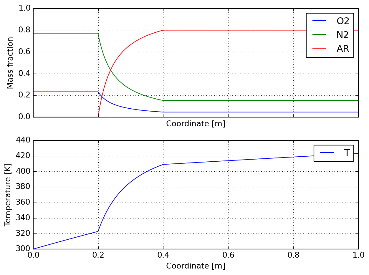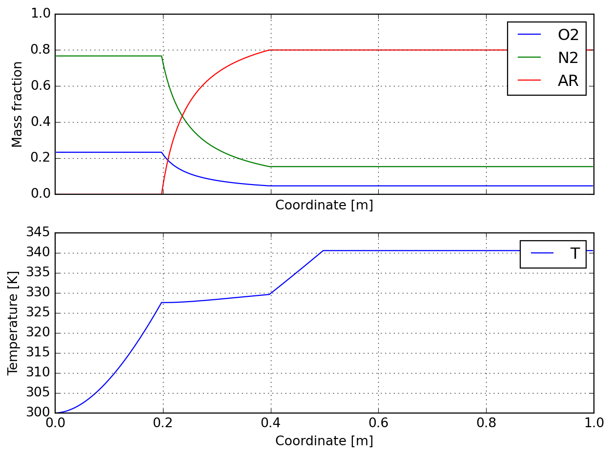 Finally we illustate the composition and temperature profiles induced by the simultaneous mass and heat transfer: