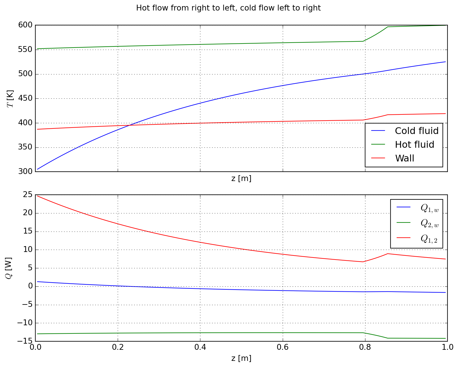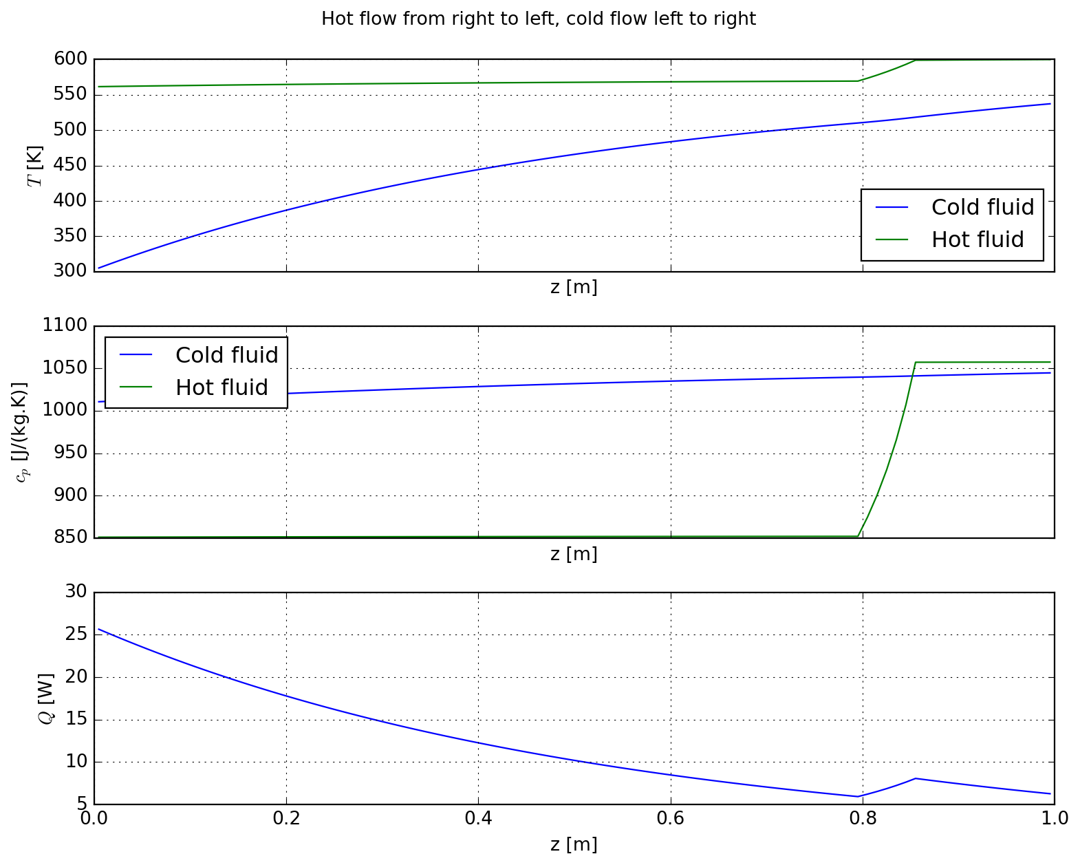 Finally we display the results; for the hot stream we observe a sharp decrease in temperature (and associated specific heat capacity) due to argon dilution. Cold stream progressivelly heats up along the channel length as expected.