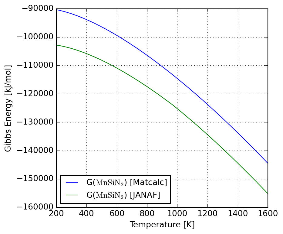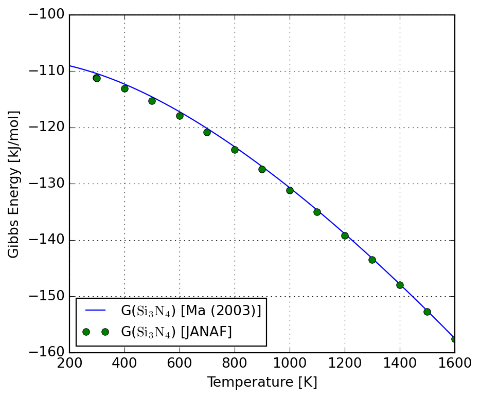 tab_nn4si3 = db["Si3N4"]The value of \(G-H(SER)\) has been fixed in JANAF data and must now be compatible with the polynomial by Ma (2003).
