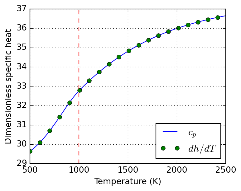 nasa7 = Nasa7Thermo.from_species(species, T)Here we illustrate the use of algorithmic differentiation to compute the derivative of the specific enthalpy with respect to temperature.