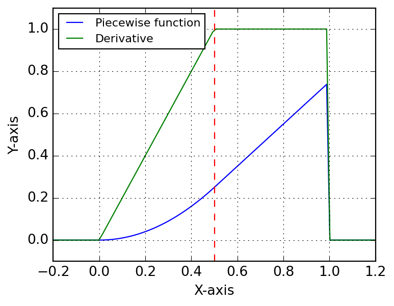 ydot = Function("fdot", [T], [jacobian(Y, T)])Below we plot the piecewise function and its derivative. The function is continuous, but the derivative is not, as expected, although the transition is handled smoothly by the Heaviside functions. The red dashed line indicates the breakpoint at x = 0.5, where the function transitions from f to g.